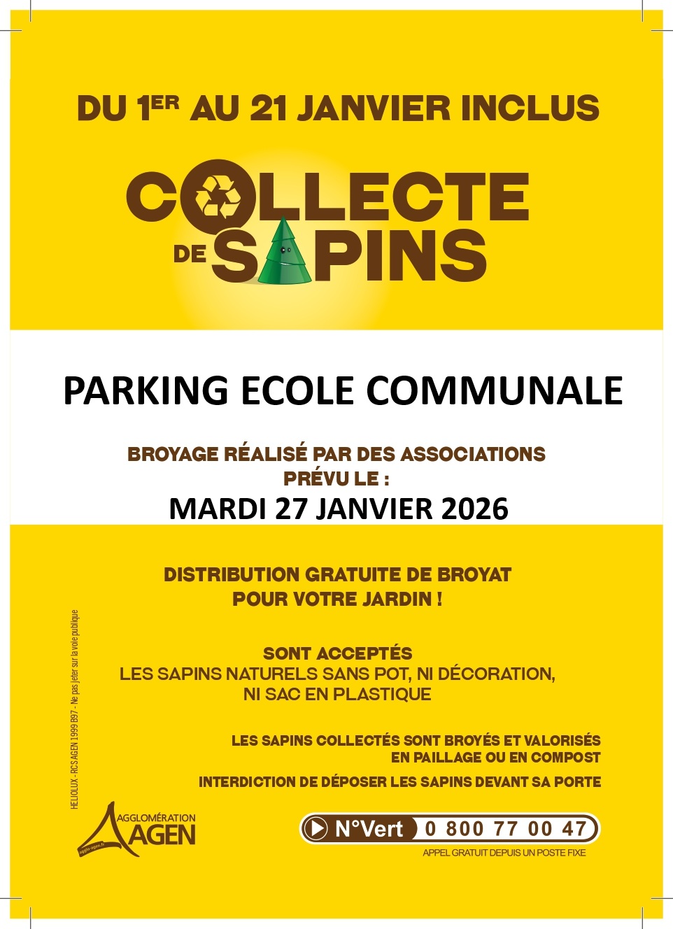 L’opĂ©ration de collecte des sapins se dĂ©roulera à  AUBIAC du lundi 1er au dimanche 21 janvier 2026 inclus sur une zone identifiĂ©e avec de la rubalise situĂ©e sur le parking de l’Ă©cole communale.